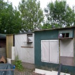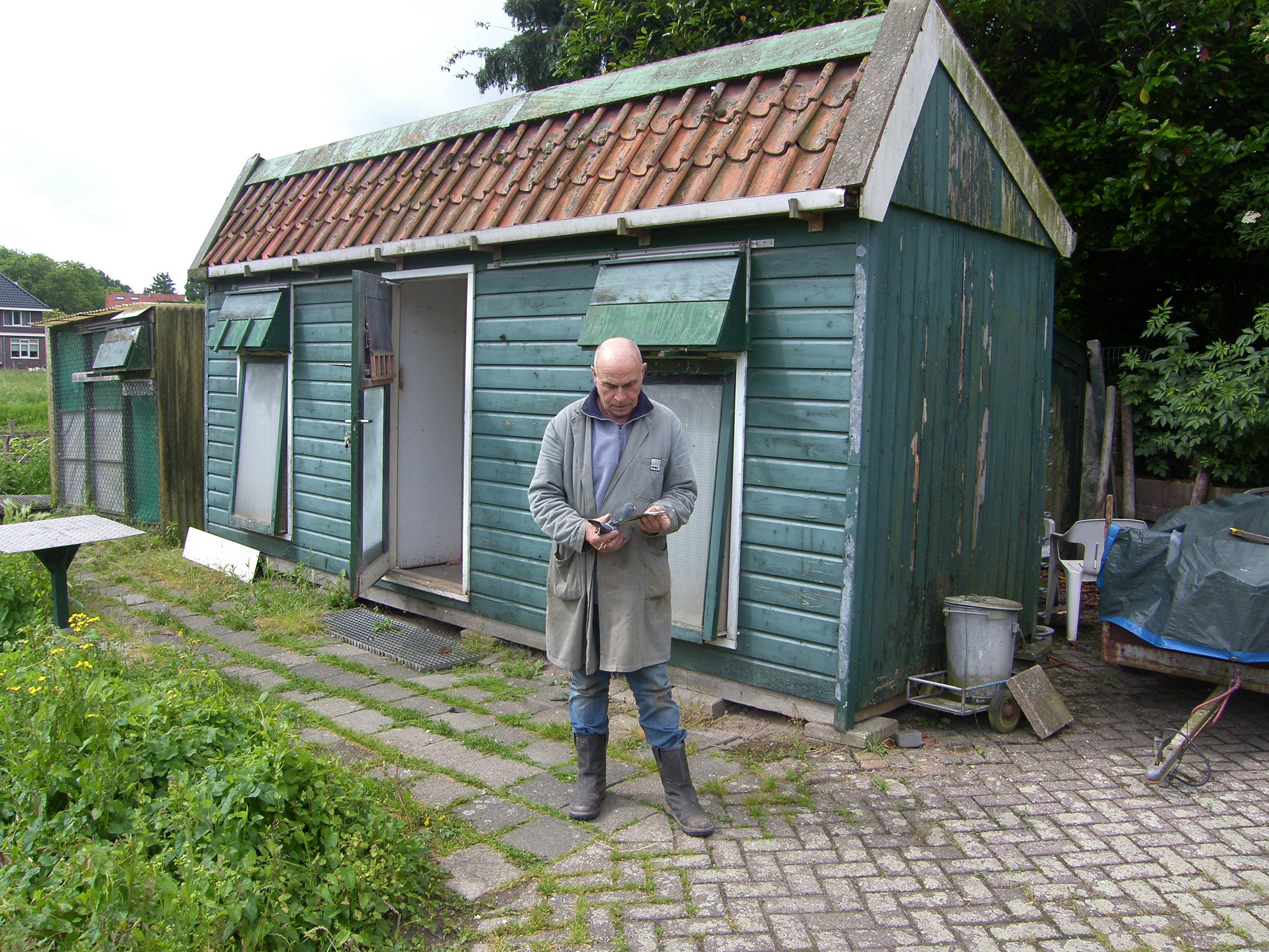 Een telefoontje gepleegd en een afspraak gemaakt , Ik zou bellen vanaf het parkeerterrein van metro Hoogvliet en Jaap zou me dan verder naar zijn landje loodsen. Maar wat de duiven kunnen kan ik ook, de weg vinden naar een hok dus plotseling stond ik achter Jaap die druk bezig was zijn knoflook bollen te snijden voor de duiven. De keetwagen van Jaap, waar een gezellige rommelige sfeer in hangt, rook een beetje naar een Turks eetcafé. Maar de koffie stond klaar en met een overheelijke Amsterdamse koek erbij was het al snel gezellig.