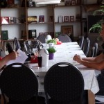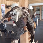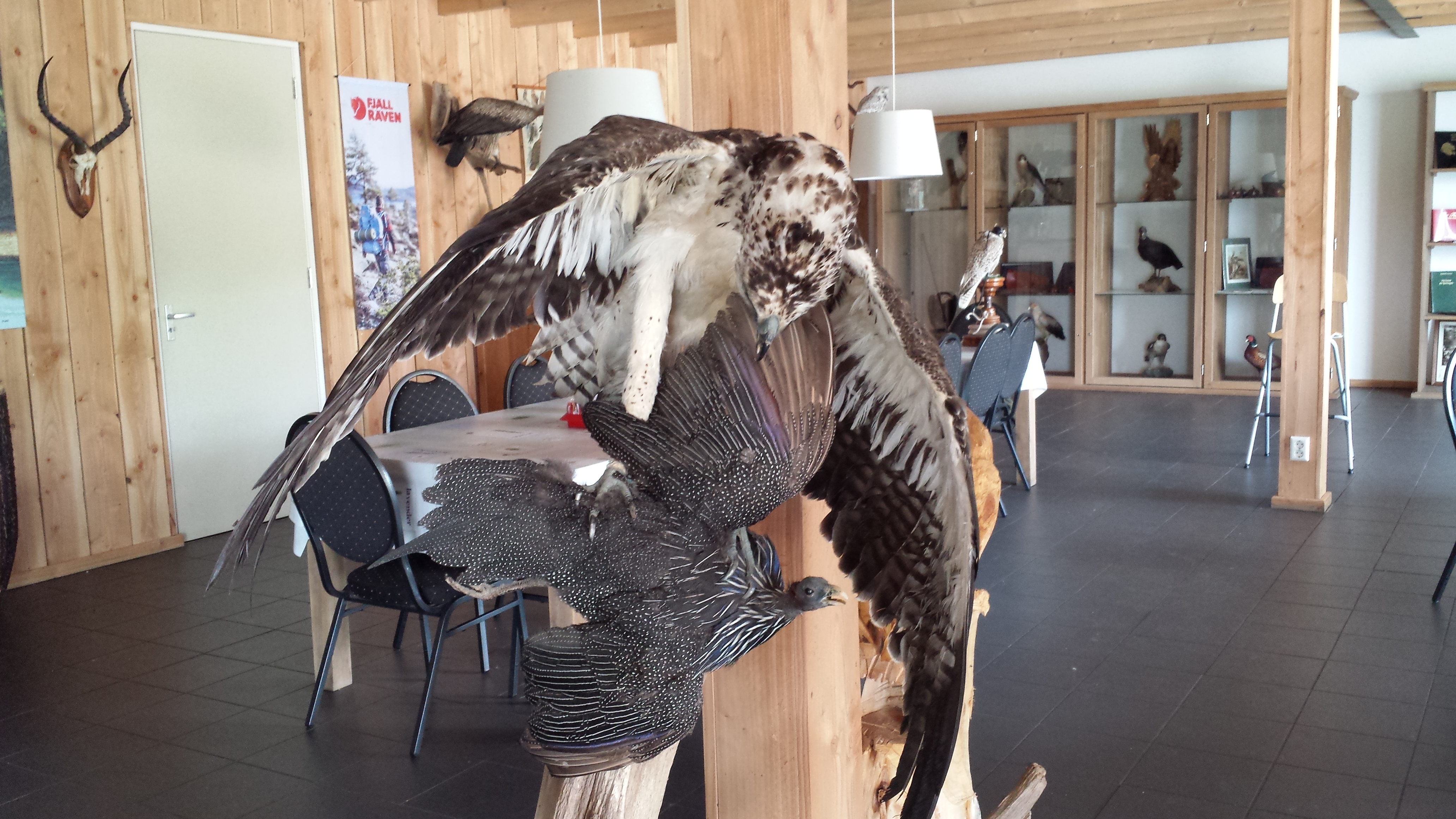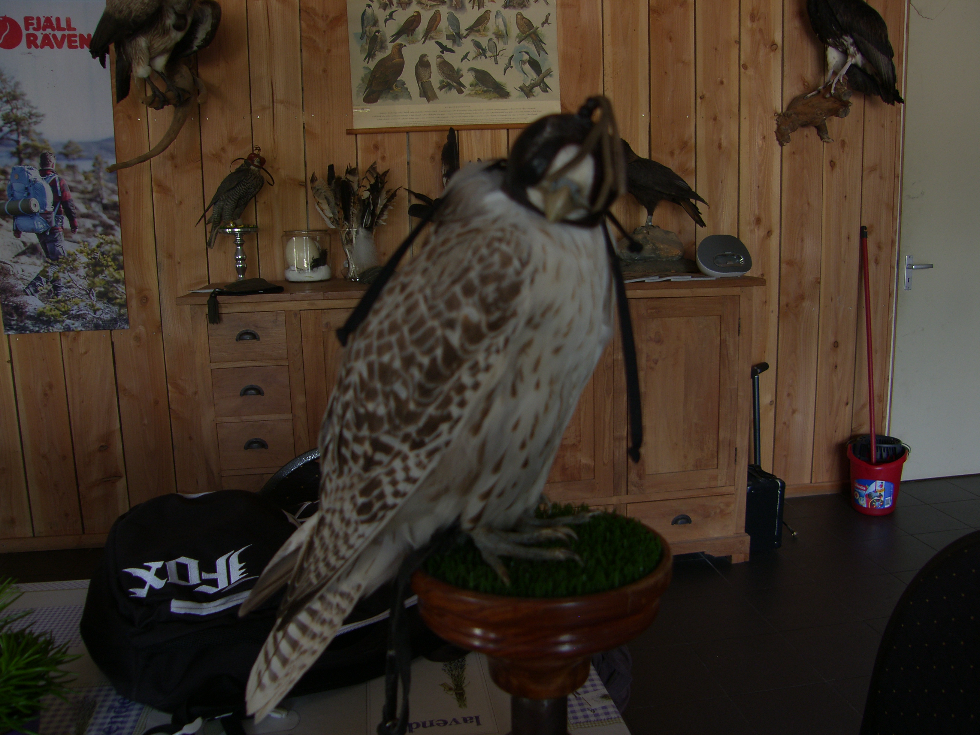 duivenhok zag staan. Ben kwam direct uit huis naar ons toelopen terwijl wij zijn ooievaars stonden te bekijken. En niet alleen ooievaars heette ons welkom, ook een drietal kalkoenen, enkele waterschildpadden en enkele pelikanen. Ben geeft aan dat we even met hem mee moeten lopen zodat hij het één en ander kan laten zien. We komen in een mooi onderkomen wat bijna op het Natuurmuseum lijkt , prachtige opgezette vogels in alle soorten en maten en op een professionele wijze geétaleerd. Prachtig gedekte tafels, alles ziet er perfect uit, in deze ruimte zullen we later de reportage gaan maken maar eerst gaan we verder. We gaan langs prachtige ruimtes die ik weiger kooien te noemen. Ruimtes die ruim zijn opgezet met in elke ruimte één of een koppel vogels. Diverse arenden, diverse uilensoorten , diverse giersoorten en zelfs twee prachtige wolven. Mijn lieveling was een prachtige vogel die zogezegd hevig verliefd was op Ben en door hem kunstmatig was geinsemineerd. Ook dat doet Ben met zijn vogels, al snel werd duidelijk dat we hier met iemand met passie voor dieren van doen hadden en tijdens het gesprek werd dit steeds duidelijker. Ben heeft geen vogels maar is er zelf één, hij communiseert met ze met eigen geluidjes en de vogels kennen hem allemaal. Gewoon met blote handden trotseerd hij die vlijmscherpe snavels, ze doen hem helemaal niets en hebben zich helemaal aan hem overgegeven. Ben geeft ook shows, cursussen en workshops met zijn dieren en is overal een graag geziene gast. Rondleidingen vinden ook plaats op de Roofvogelboerderij en ik vind het een aanrader.