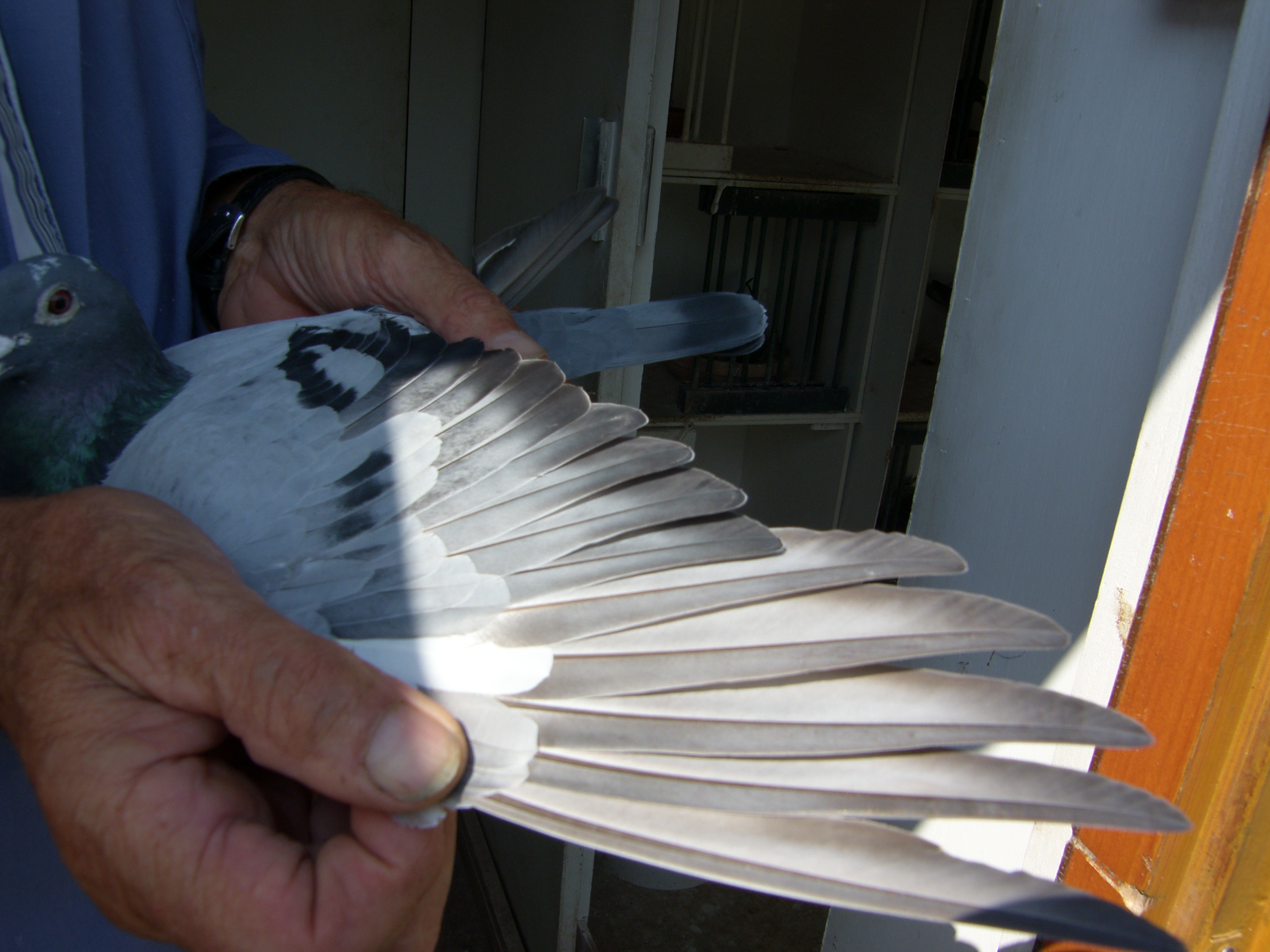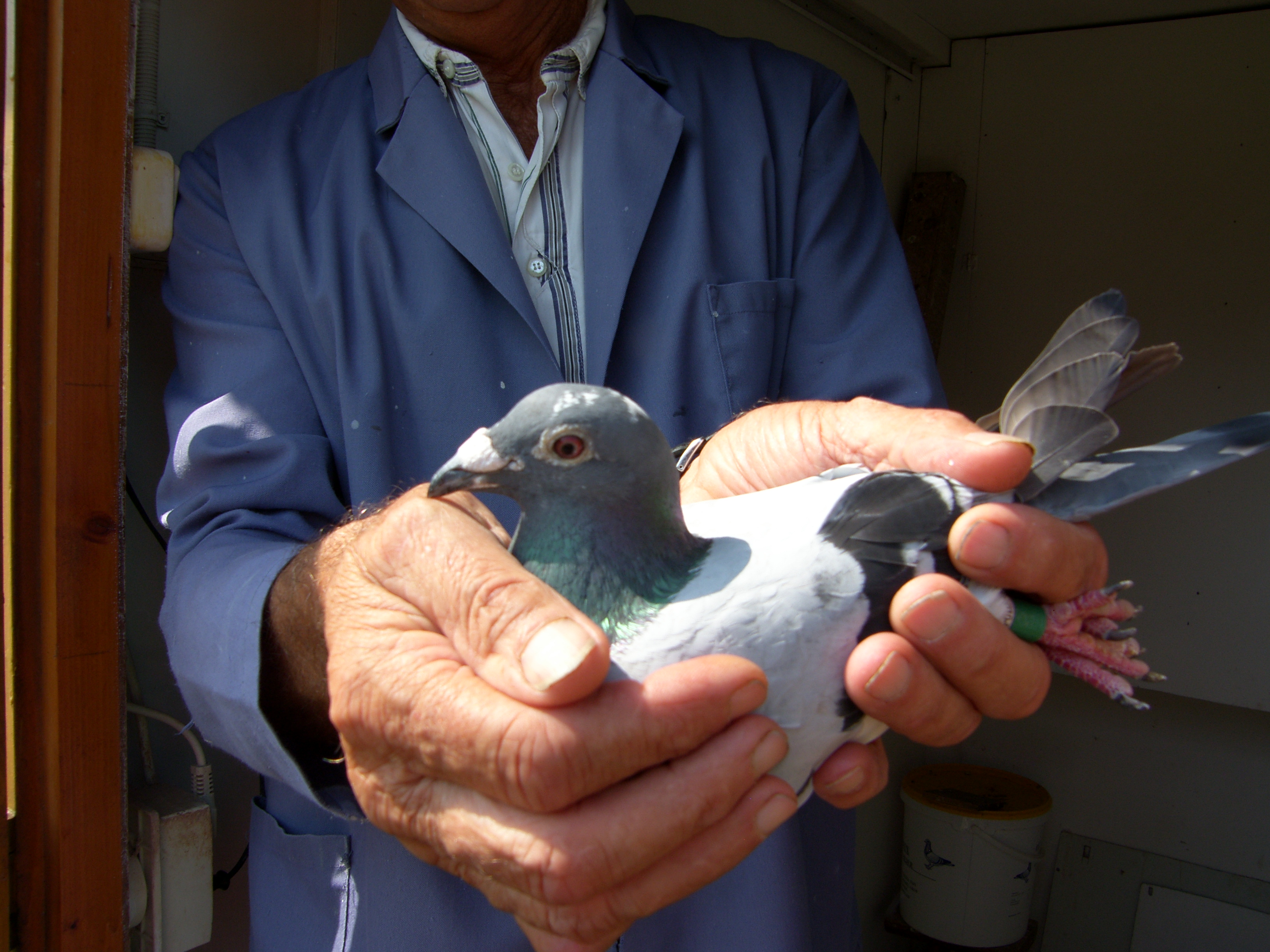 Bij het hok aangekomen hoorde ik al de muziek klinken. Muziek van Nick en Simon ,zijn duiven zijn er dol op en heel de dag staat de radio bij de duiven aan,iets waar Ger heilig in gelooft dat dit goed voor ze is. Wie denkt dat Ger een allegaartje aan duiven heeft zitten slaat de plank volledig mis, hier zitten duiven van alle tophokken, hoe Ger daar aan geraakt ? Hij gaat er gewoon met een mand naar toe en vraag of ze er een paar jongen in willen doen. Ik zeg dat ik het wel een beetje brutaal vind, waarop Ger antwoordt ,,ze kunnen toch nee zeggen,,.