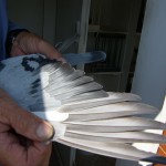 om een pittig vluchtje tegen de elementen onderweg aan te gaan. Om 16.58.39 knalt de Blauw Bonte weduwnaar de NL 01-1683447 uit de lucht en laat de 1306 tegenstrevers in de RMO achter zich met 1184.948 mpm. Deze weduwnaar is weer zo’n duif die Ger kreeg van Cock van de Ende , dus pure klasse. Kopvliegers van huis uit zoals Rotterdammers dat noemen.