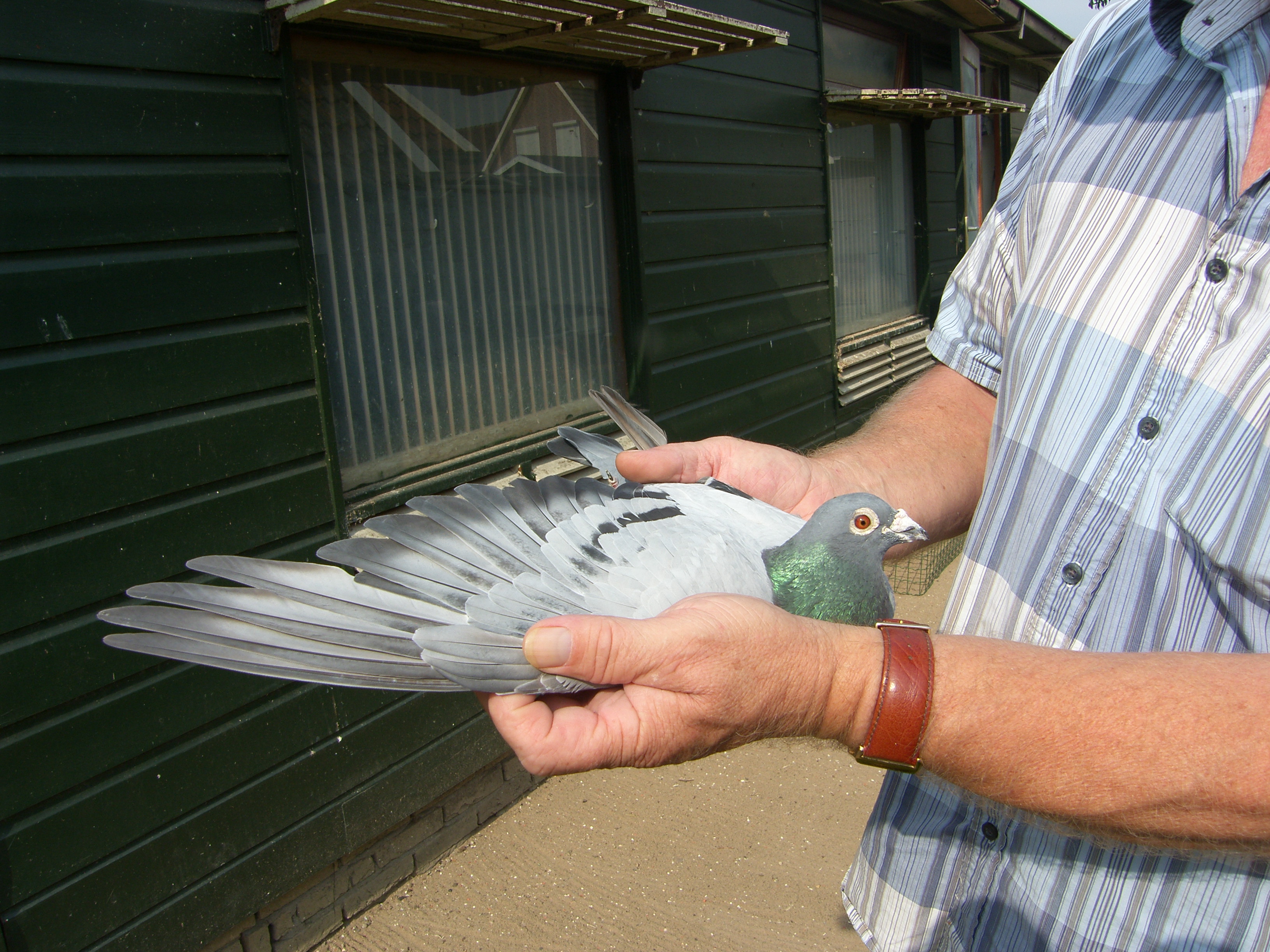pracht van een doffer met een perfect oog in zijn donder, een juweel in de hand . Op Narbonne wist de ouwe blauwe al zijn 204 tegenstanders in de Fondclub Groot Rotterdam voor te blijven door de 981.101 km met een snelheid van 1150.693 mpm voor te blijven. Ze tikte om 21.12.37 uur aan na om 7.00 uur gelost te zijn. Non stop 14 uurtjes vliegen, ik zie er al tegenop om het met een auto te doen. Zoals op alle fondvluchten had Dirk er 10 mee en draaide er 3 op de prijslijst.